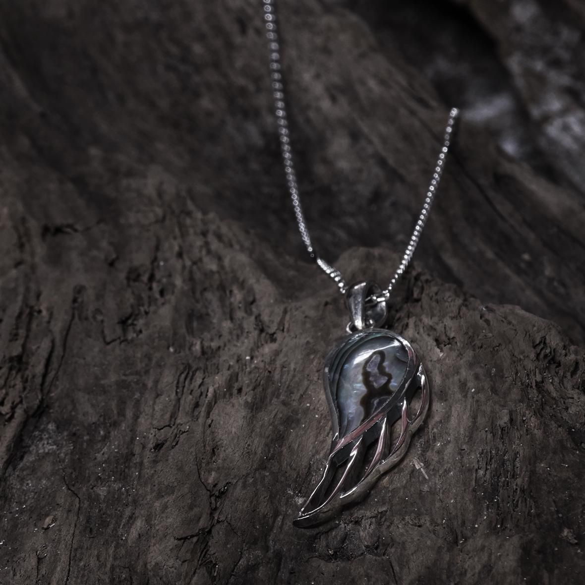 羽をイメージさせる繊細なデザインと石の組み合わせが美しいペンダントトップ。